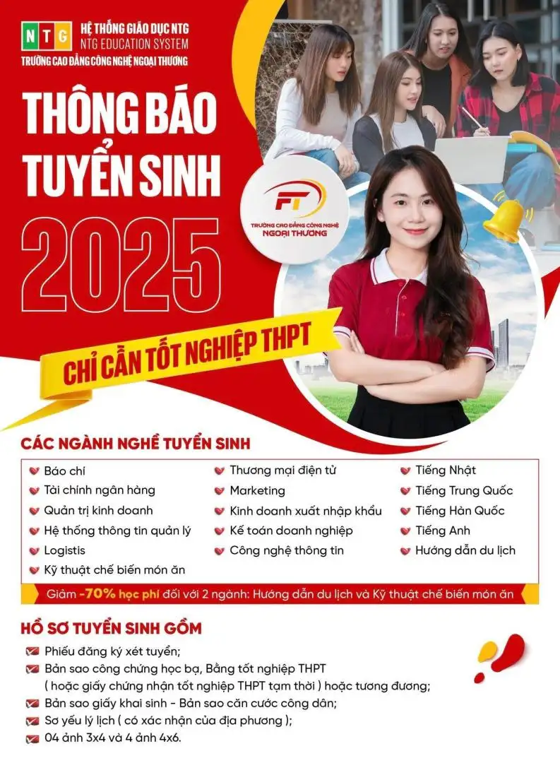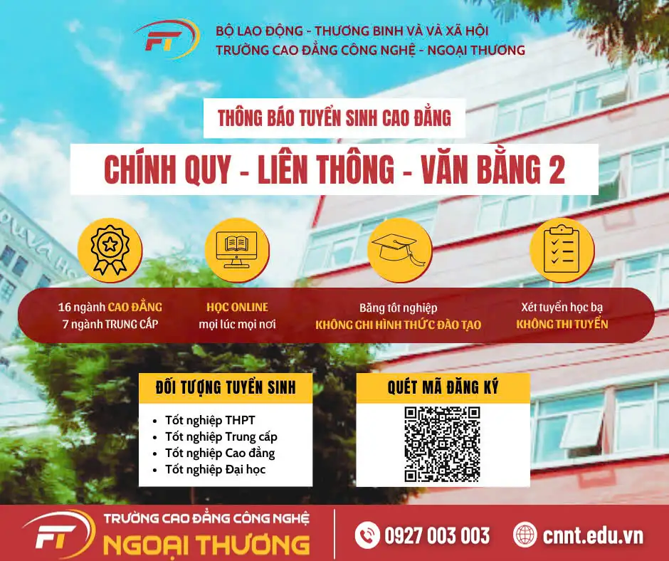 Trường Cao Đẳng Công Nghệ – Ngoại Thương thông báo tuyển sinh Cao đẳng hệ đào tạo từ xa năm 2025 theo phương thức xét học bạ THPT, hoặc điểm thi tốt nghiệp THPT.